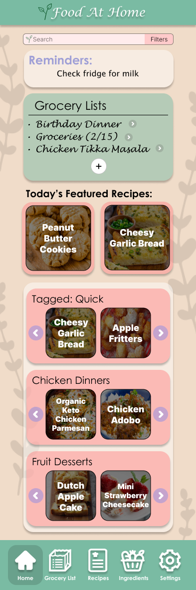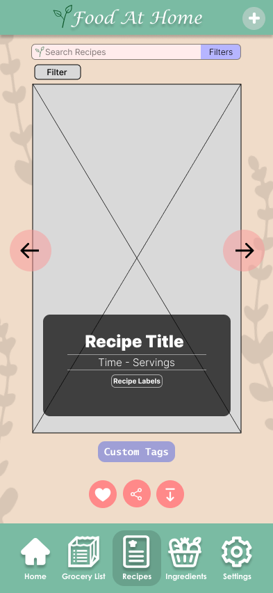 The Home Page showcases the main features of Food At Home. First, a Search bar scans any keywords, so whether you’re looking for a specific ingredient to check to calories or hunting for vegan options you can find what you need. A quick reminders bar helps users know exactly what they’re forgetting, getting thoughts out of their head and into a useful location. Grocery Lists are easy to grab when popping into the store, making shopping easy. The section titled Today’s Featured Recipes will present two recipes that users can make given the ingredients they currently have in their kitchen, while the white box below holds carousels for tags, topics, and categories of recipes to fit any fleeting craving. These carousels will change daily, to keep your meal plan varied and maybe even spontaneous.
