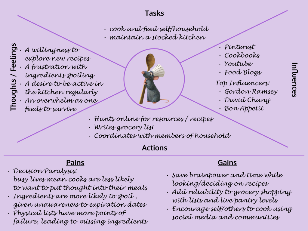 A key component in designing an app like this is to really understand the individual who would most use and benefit from this tool. Pictured left is an empathy map I created using data from the preliminary survey, showcasing what the average home cook sees, hears, thinks, and does, as well as general pain points and nice-to-haves for their kitchen.