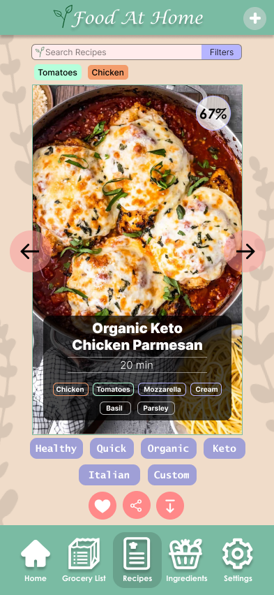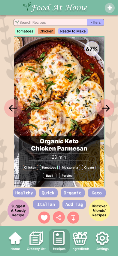First, the Recipe page will entice users with currently available recipes, separating ingredients into “preferred” and “necessary” based on user preference and presenting the recipes that can be made, right now at home. A percentage in the corner will show you what proportion of ingredients you currently have stocked, as the title card will showcase the recipe details including how long the recipe will take and what main ingredients are inside. Below this carousel, you can see the tags associated with the shown recipe, which categorizes the database based on user-input or automatically generated characteristics such as cuisine, dietary restrictions, meal types, and any other qualifiers you can think of.