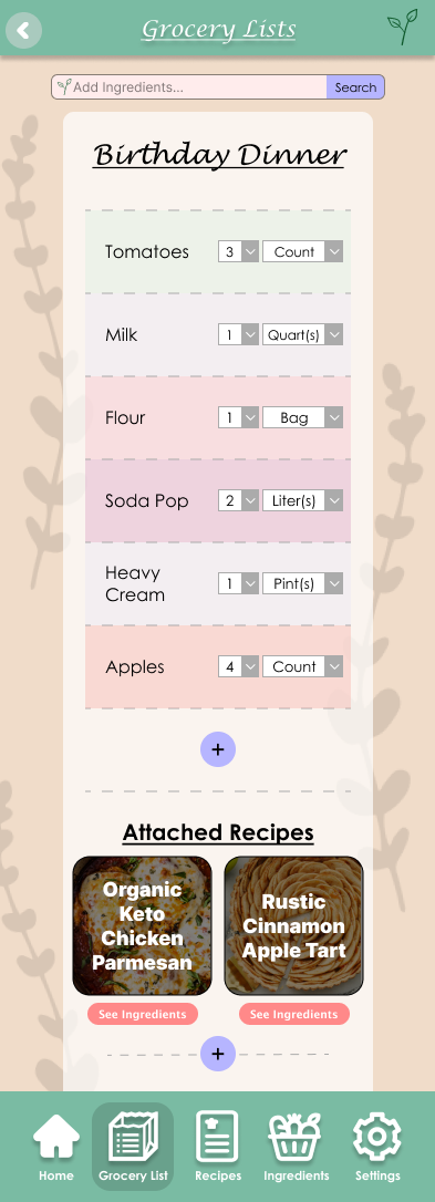 The Grocery Lists are a straightforward collection of pages that first show all available lists then narrow down to a specific grocery list tailored from any recipe, created for any event, or automatically populated with ingredients as they run out.