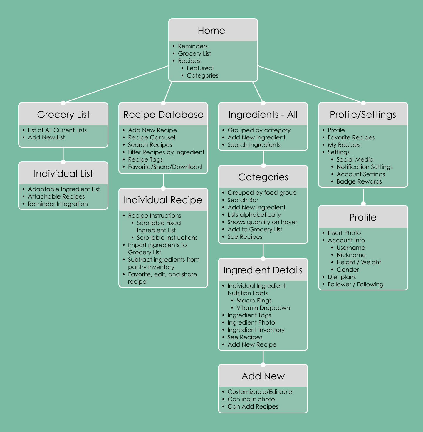 A huge problem across home cooks comes down to food waste and ingredient management. The age-old problem of using your produce at a stable steady rate, as to finish the ingredients before the wilting, wrinkling, or browning of any groceries throughout the week. Restaurants fail primarily due to mishandled costs, and managing your revenue begins with managing your inventory. The same applies in a home kitchen; maximizing efficiency reduces cost and food waste, and knowing what you can cook in your home can even realize more opportunities for meals that may not be so apparent. User needs followed the organic path of the grocery cycle itself - from collecting and managing ingredients, to cooking new and exciting recipes on the regular, right back to purchasing more groceries with our convenient lists.