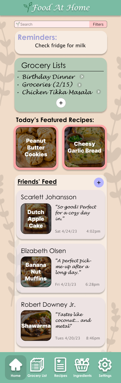 The average user would likely be a young homemaker trying to keep tabs on their kitchen through their busy lives. Soccer moms with kids or health and fitness influencers, those looking to learn new recipes and grow as chefs would be a target audience for this system, as it would allow for scalability as the amount of beloved recipes grows. Anyone who hosts large events like Fourth of July barbecues or Thanksgiving dinner would find utility in the ability to manage grocery lists and check the fridge inventory from anywhere. Food At Home finds its’ users in foodies across demographics, but thrives in the standard American home, allowing for cohesion between the whole house and efficiency across the routine.