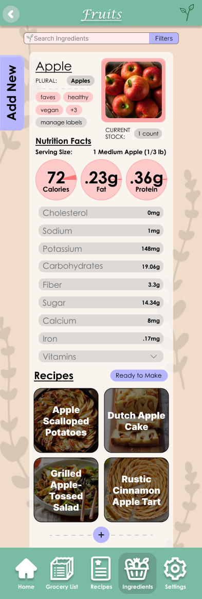 The heart of the app, the Ingredients tab breaks up the pantry into basic supermarket categories/food groups. A deeper dive into the section lists each ingredient, with a hover over the image to show current inventory levels and easy access buttons to see related recipes or add the item to any existing grocery lists.